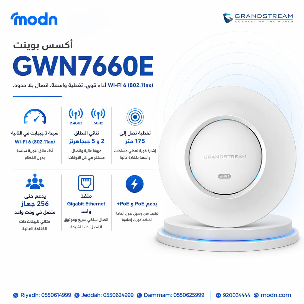 هل تبحث عن استقرار كامل لشبكة الإنترنت؟ يتوفر لدينا الآن الإصدار الأحدث والمطور أكسس بوينت جراند ستريم GWN7660E (جهاز بث الإشارة اللاسلكي). الحل المثالي للمنازل الذكية، المكاتب، والفلل التي تحتاج إلى شبكة واي فاي سريعة وتغطية لا تنقطع.