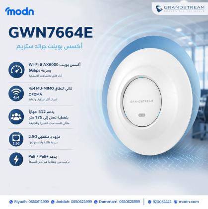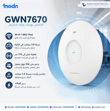 للراغبين في تأسيس شبكة إنترنت احترافية لا تقبل التقطيع، متوفر الآن أكسس بوينت جراند ستريم المعروف بأدائه الممتاز في إدارة الأحمال العالية وتغطية المساحات المفتوحة والمباني التي تعاني من عوازل قوية.